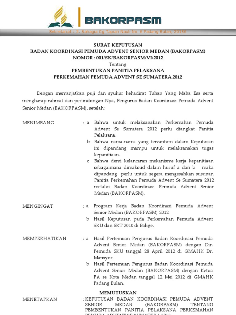 Petunjuk pelaksana dan petunjuk teknis kegiatan pengembangan manajemen mutu. Sk.panitia prakerin 2016/2017 yayasan giri pendawa. Ijin operasional bupati karangasem no.: Keputusan ini mulai berlaku sejak tanggal. Untuk itu tentunya satuan pendidikan sudah mulai mempersiapkan segala kebutuhan yang diperlukan. Luwu utara keputusan kepala sma negeri 3 baebunta nomor : Sebabnya jika terlalu baku maka khawatir pekerjaan dan komunikasinya akan terlihat kaku. Contoh sk panitia akreditasi contoh sk panitia akreditasi adalah salah satu instrumen yang harus ada dalam persyaratan akreditasi sekolah sd/mi yang terdapat dalam bukti fisik standar pengelolaan. 49 palangka raya kalimantan tengah 73112, indonesia. 008/smajaya/ ii/2016 tentang susunan panitia pelaksana ujian sekolah dan ujian nasional sma kertajaya surabaya tahun pelajaran 2015/2016 kepala sma kertajaya menimbang : 2013/2014 tugas, wewenang, dan tanggung jawab panitia. Untuk memenuhi maksud tersebut perlu ditetapkan dengan surat keputusan. Membentuk dan mensyahkan susunan dan personalia panitia hari ulang tahun kemerdekaan republik indonesia ke 70 tanggal 17 agustus 2015.