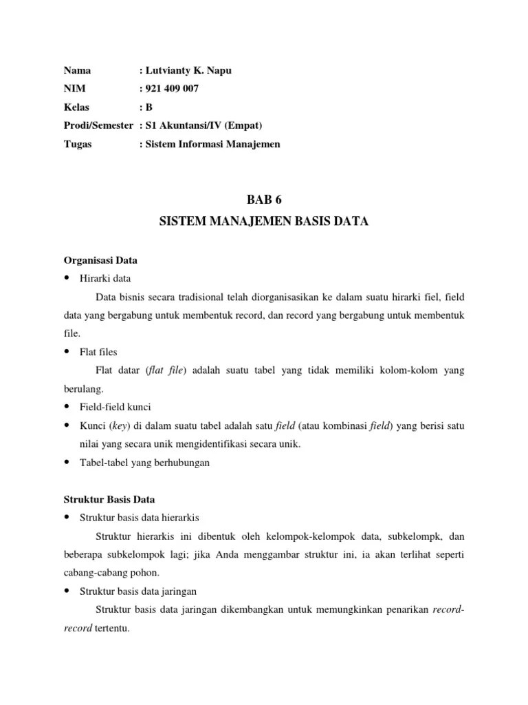 Bab 6 translasi mata uang asing (soal & jawaban). Bab 6 perancangan sistem ⇒ 77. Bab 6 sistem manajemen basis data tujuan pembelajaran setelah memperlajari. Piranti lunak sistem manajemen basis data. Accuracy of information (ketepatan informasi), dalam arti bahwa informasi yang dikelola oleh sim mampu memenuhi kebutuhan informasi. Pemanfaatan sistem informasi manajemen dalam meningkatkan mutu perusahaan. Sistem informasi manajemen bab 7 soal kasus google, apple, and microsoft . Sistem informasi perusahaan umum pegadaian. Disusun untuk memenuhi sebagian tugas mata kuliah . Berdasarkan dari penelitian pada iain batusangkar jurusan manajemen. Latihan soal (uraian/essay) bab sistem informasi manajemen. Jelaskan mengenai model sistem informasi manajemen! Kontroversi yang membingungkan di sekitar.